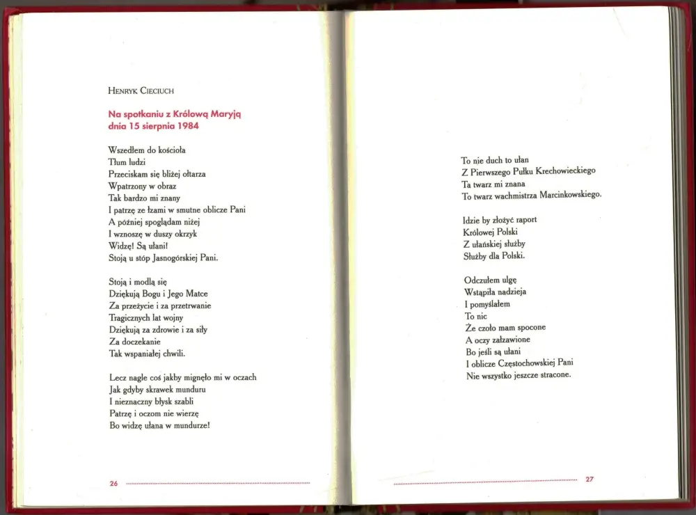 Jerzy Maciejewski w książce Saga o 1 Pułku Ułanów Krechowieckich im. Pułkownika Bolesława Mościckiego wydanej w 2003 roku w Dąbrowie Górniczej zamieścił wiersz poety powstały z inspiracji uroczystością w parafii Matki Boskiej Częstochowskiej w Augustowie, na której terenie mieszkał. Poświęcony był przybyciu obrazu Maryi czczonej przez ułanów. Tenże wiersz z nadanym tytułem „Na spotkaniu z Królową Maryją dnia 15 sierpnia 1984” został opublikowany w antologii Augustowscy ułani. Wybór utworów inspirowanych dziejami 1 Pułku Ułanów Krechowieckich im. Bolesława Mościckiego. Antologię zredagowały Irena Batura, Bożena Diemjaniuk i Józefa Drozdowska w 2017 roku, a wydały Augustowskie Placówki Kultury wraz ze Stowarzyszeniem Inicjatyw Społeczno-Kulturalnych „Nad Czarną Hańczą”.