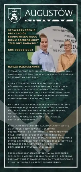 | 0000612002 | Stowarzyszenie Przyjaciół Środowiskowego Domu Samopomocy “Zielony Parasol” |