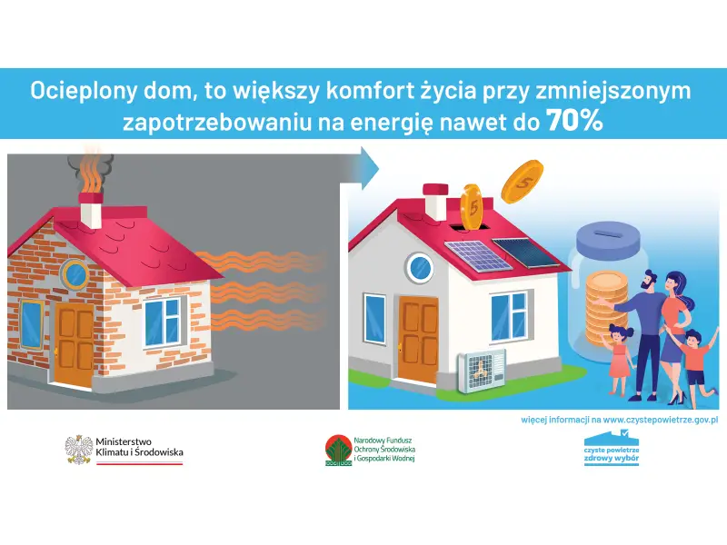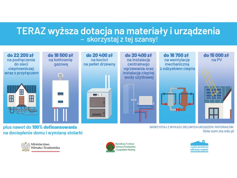 Z programu Czyste Powietrze otrzymasz wsparcie na docieplenie ścian, dachu, wymianę okien i drzwi, zainstalowanie wentylacji z odzyskiem ciepła. Dofinansowana może być także wymiana starego pieca na nowe, efektywne źródło ciepła, które zużywa mniej energii. To wszystko z pożytkiem dla rodzinnego portfela oraz mniejszą emisją zanieczyszczeń do powietrza w Augustowie.
