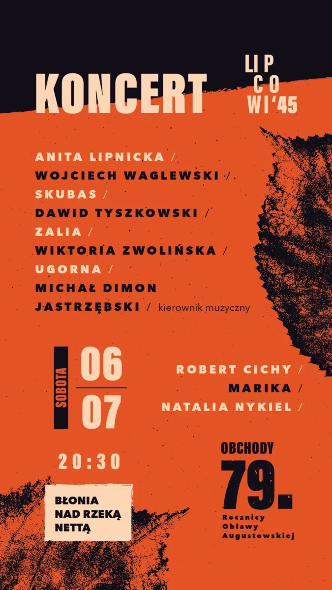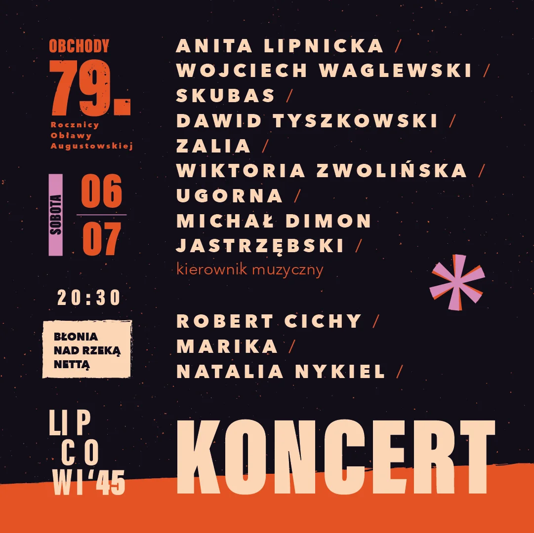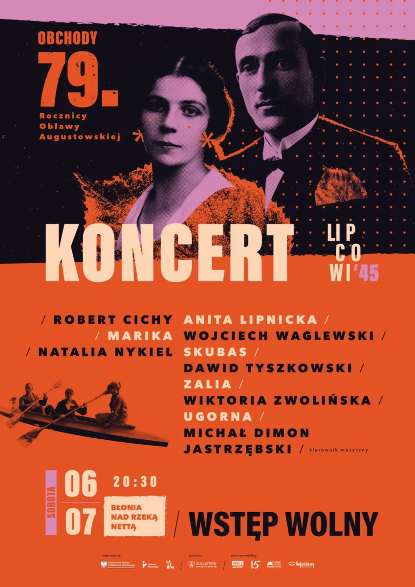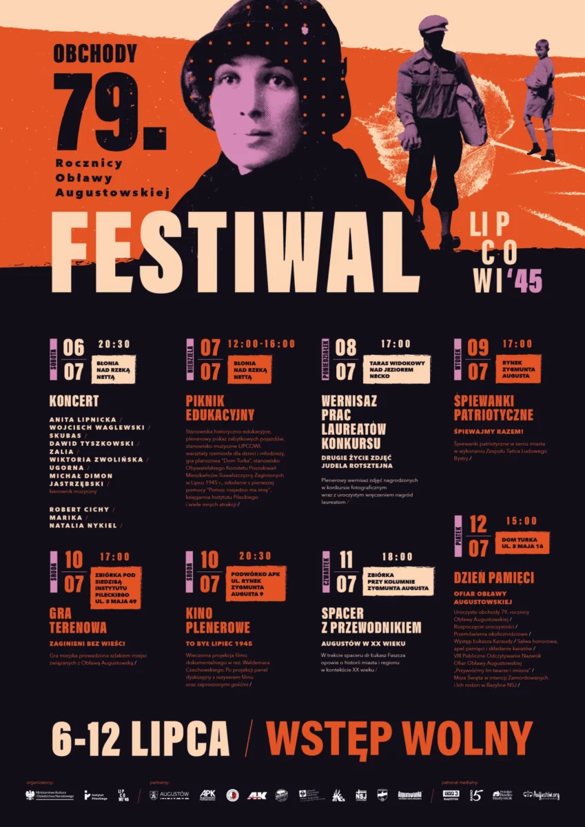 Wydarzeniem inaugurującym festiwal będzie koncert LIPCOWI’45, który rozpocznie się w sobotę 6 lipca o godz. 20:30 na błoniach nad rzeką Nettą w Augustowie. Tym razem opowiemy o Obławie za pomocą piosenek z historii polskiej muzyki w zupełnie nowych, współczesnych aranżacjach, wykonanych przez duety artystów z różnych pokoleń. Wystąpią m.in. Anita Lipnicka, Zalia, Ugorna, Skubas, Wojciech Waglewski (Voo Voo), Dawid Tyszkowski, Wiktoria Zwolińska, a także Marika, Natalia Nykiel oraz Robert Cichy. Kierownikiem muzycznym przedsięwzięcia jest Michał DIMoN Jastrzębski – muzyk, perkusista, autor tekstów oraz współzałożyciel zespołu Lao Che. Za reżyserię koncertu odpowiada Aleksandra Górecka – scenarzystka, reżyserka, realizatorka oraz montażystka. W trakcie wieczoru usłyszymy także utwory będące zapowiedzią płyty LIPCOWE’45, która ukaże się już w sierpniu.