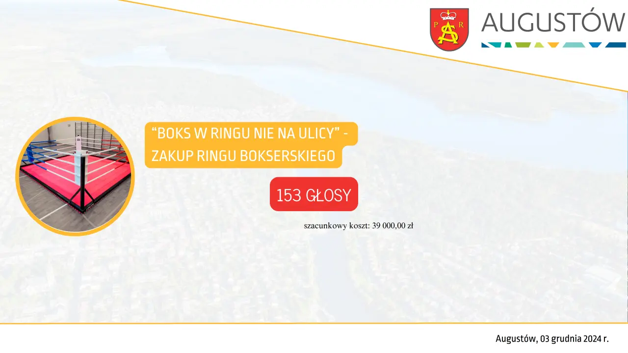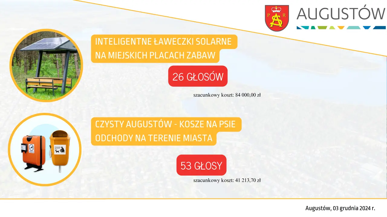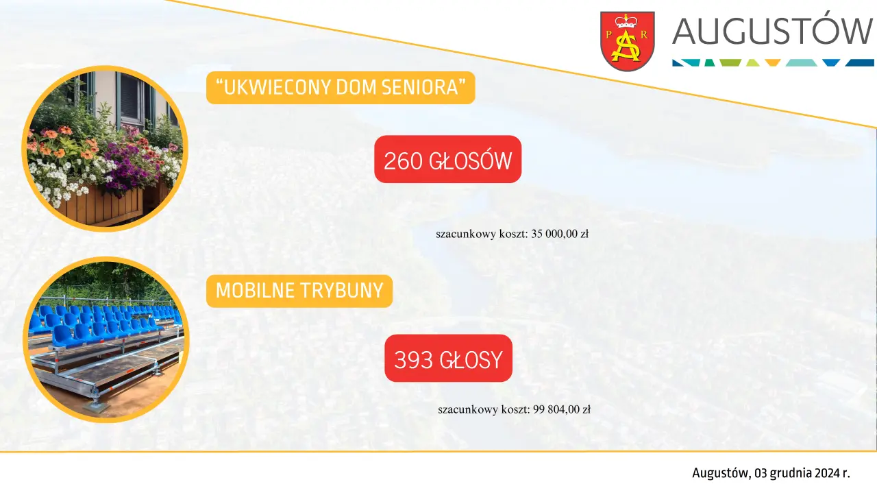 Kolejne miejsce i 483 głosy zdobyła wyceniona na 66 tys. zł akcja sterylizacji psów i kotów. Aż 393 augustowian poparło wart niemal 100 tys. zł zakup mobilnych trybun, które będzie można wykorzystywać w czasie zawodów sportowych lub koncertów. Natomiast wydatek 35 tys. zł na ukwiecenie sąsiedztwa Domu Seniora zdobył 260 tys. zł.