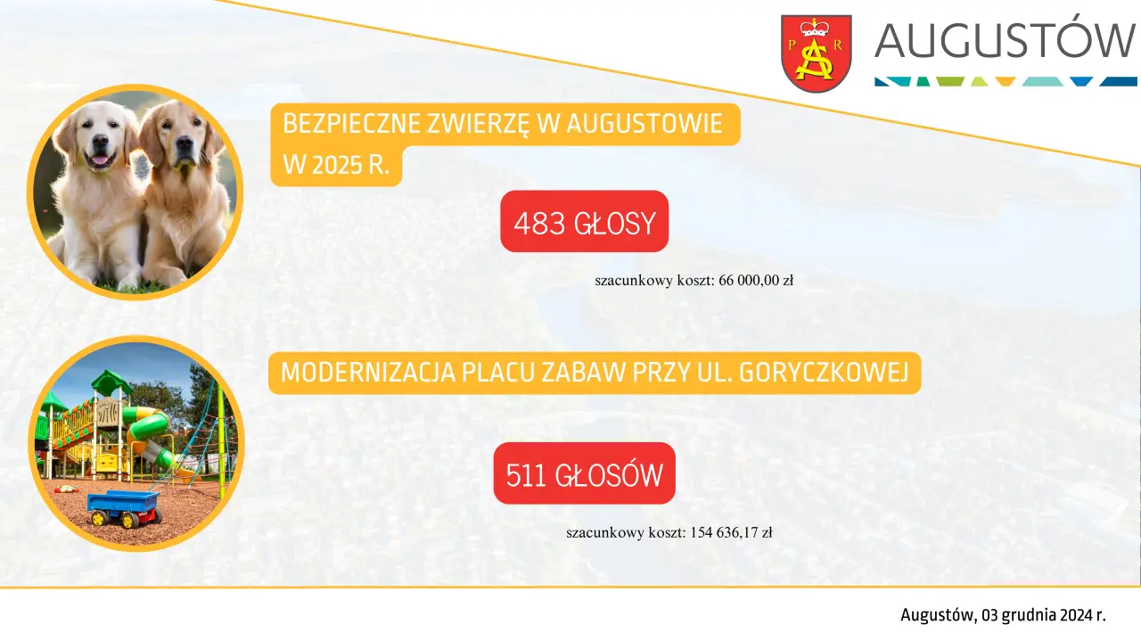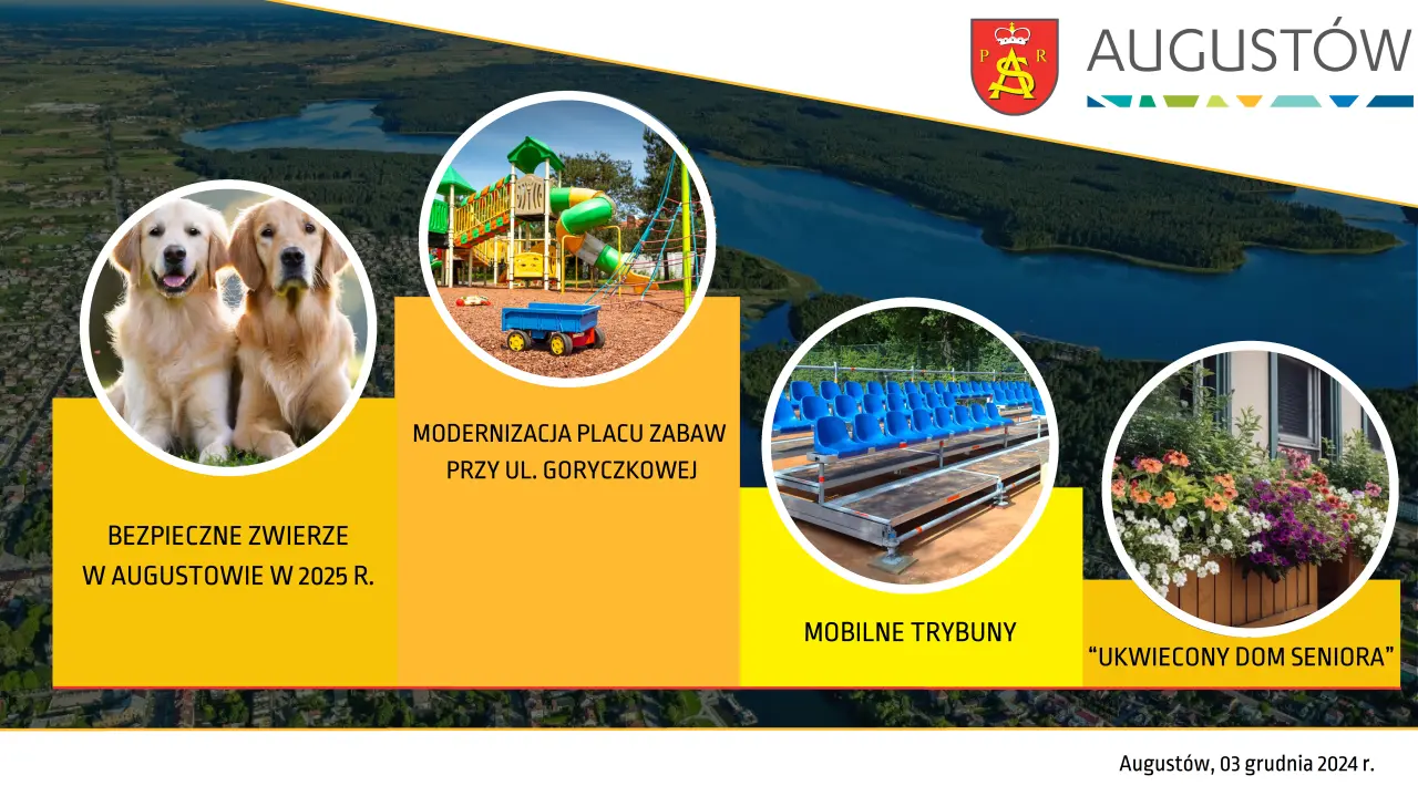 Plac zabaw przy ulicy Goryczkowej, program sterylizacji psów i kotów, mobilne trybuny sportowe oraz ukwiecenie terenów wokół Domu Seniora. To cztery projekty, które augustowianie wybrali w ramach przyszłorocznej odsłony budżetu obywatelskiego.