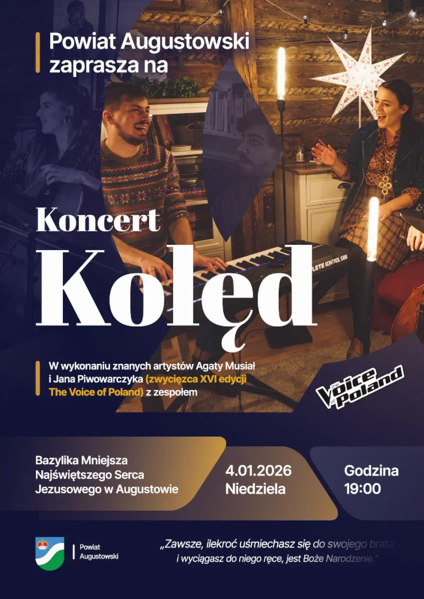 Powiat Augustowski zaprasza na Koncert Kolęd w wykonaniu znanych artystów: Agaty Musiał i Jana Piwowarczyka (zwycięzca XVI edycji The Voice of Poland) z zespołem.