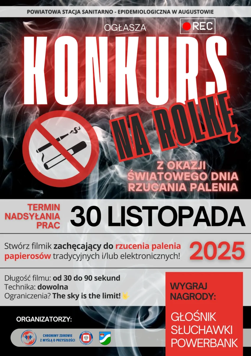 W związku ze zbliżającymi się obchodami Światowego Dnia Rzucania Palenia, Państwowy Powiatowy Inspektor Sanitarny w Augustowie zaprasza do udziału w konkursie filmowym dla uczniów szkół ponadpodstawowych z powiatu augustowskiego.