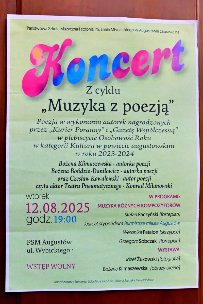 12 sierpnia w Państwowej Szkole Muzycznej I stopnia im. Emila Młynarskiego w Augustowie odbyło się drugie wakacyjne spotkanie w ramach cyklicznych koncertów „Muzyka z poezją”. To wydarzenie potwierdziło, że lokalne wydarzenia artystyczne mają ogromną moc przyciągania ludzi.