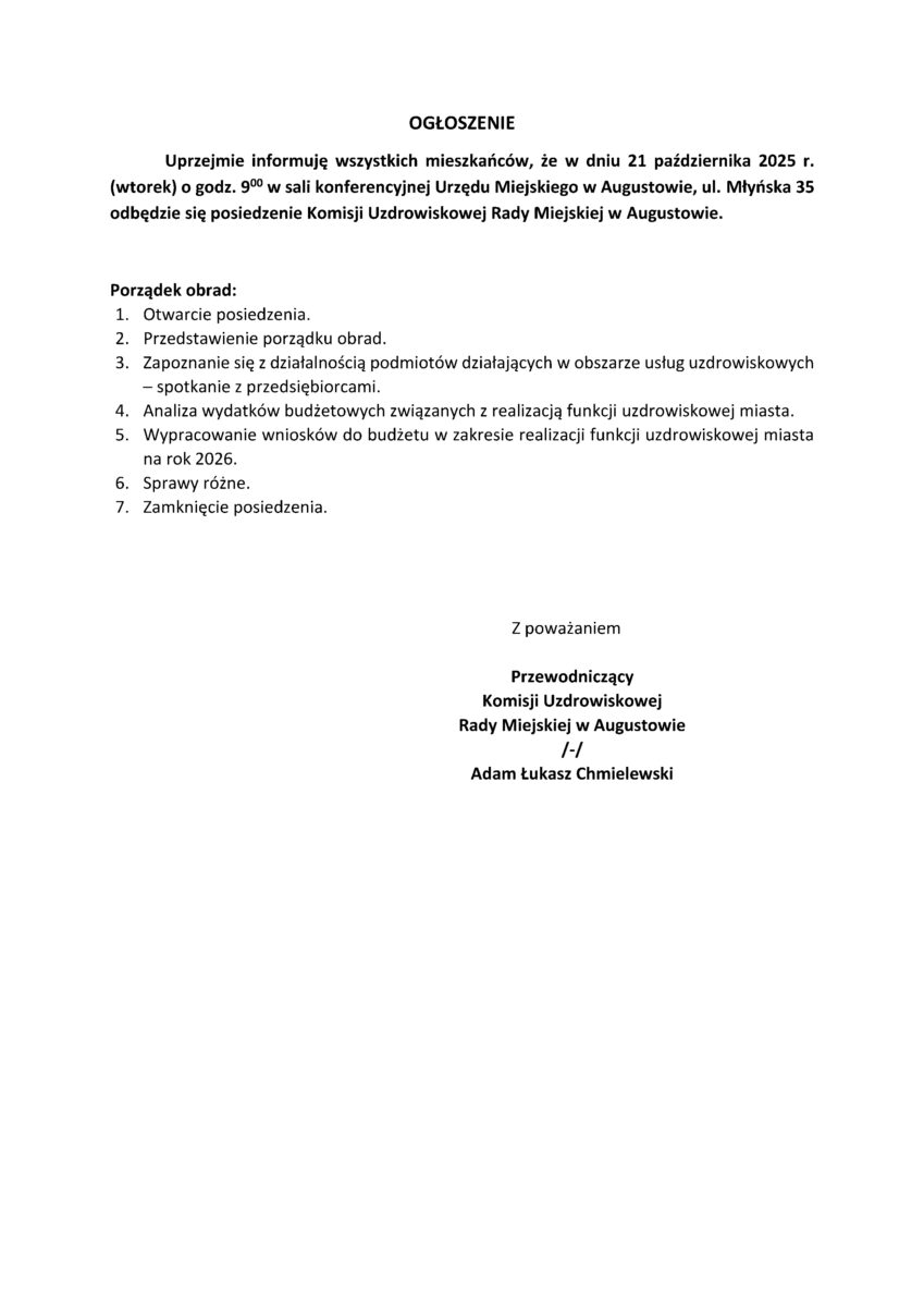 Uprzejmie informuję wszystkich mieszkańców, że w dniu 21 października 2025 r. (wtorek) o godz. 9:00 w sali konferencyjnej Urzędu Miejskiego w Augustowie, ul. Młyńska 35 odbędzie się posiedzenie Komisji Uzdrowiskowej Rady Miejskiej w Augustowie.