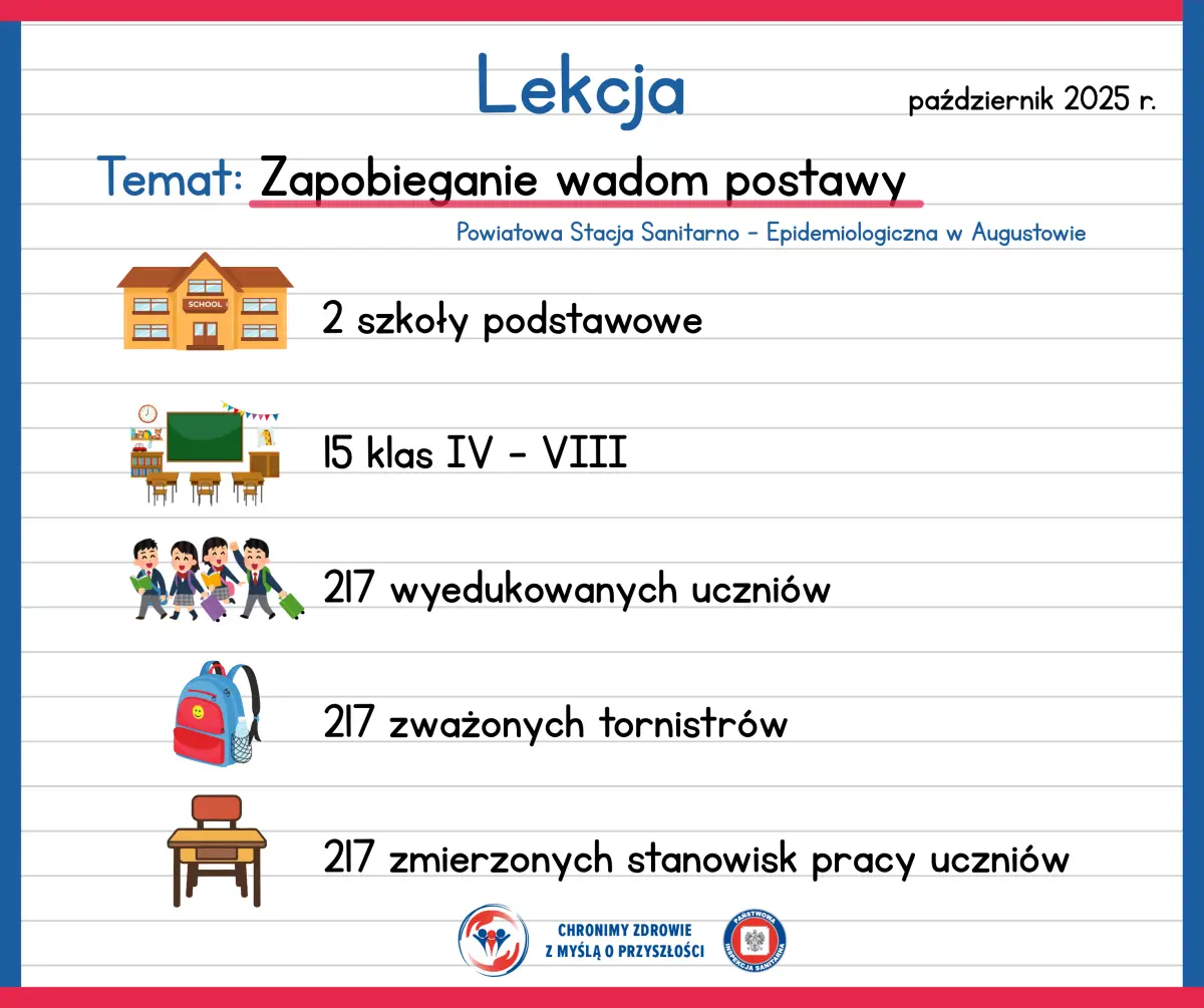 W nowym roku szkolnym 2025/2026 rozpoczęliśmy w październiku I etap akcji kontrolno-edukacyjnej na rzecz eliminacji ryzyka rozwoju wad postawy u dzieci i młodzieży.