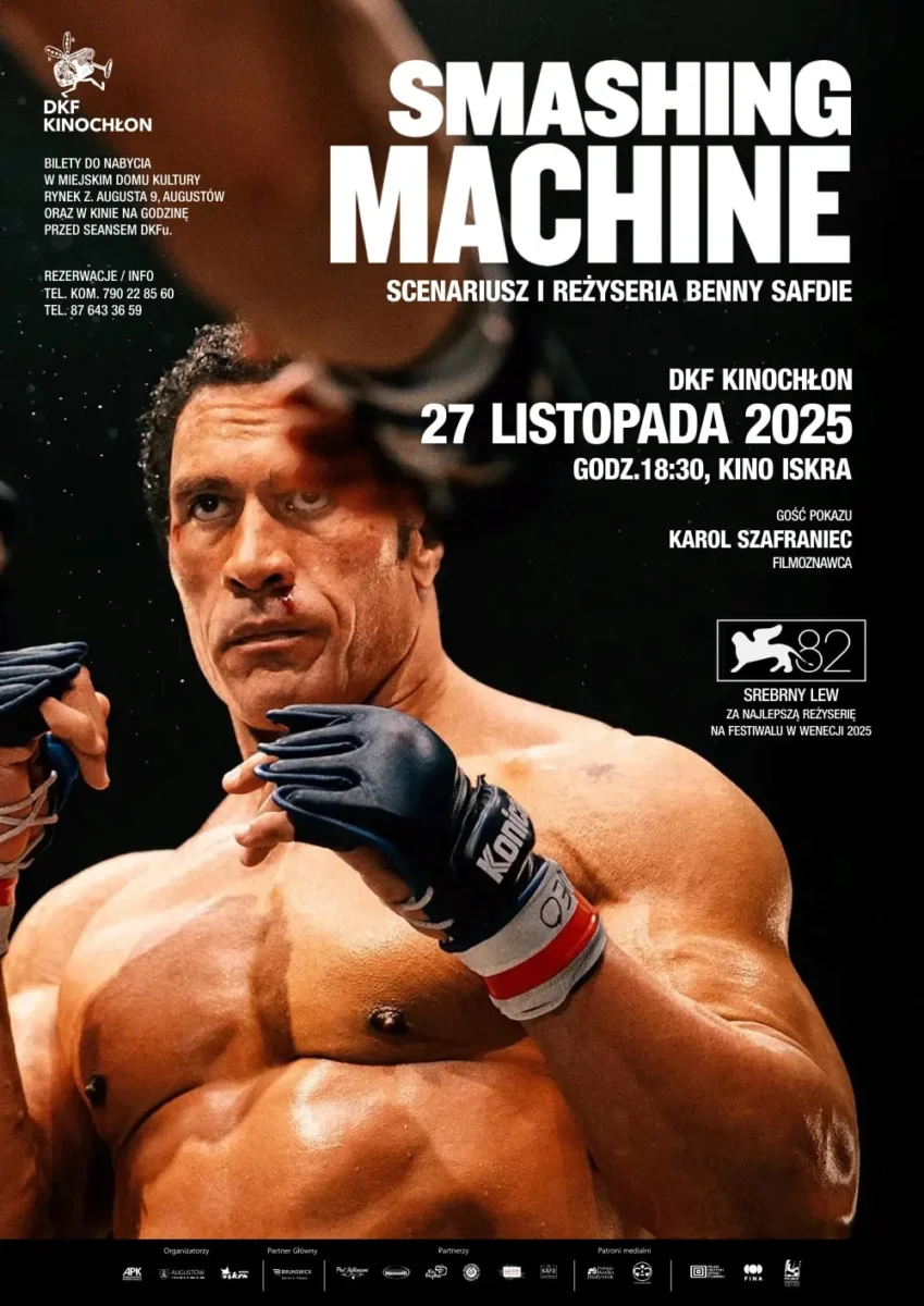 Augustowski DKF KINOCHŁON zaprasza w czwartek 27 listopada 2025 roku o godz. 18:30 do kina Iskra (ul. 3 Maja 38) na pokaz filmu „Smashing Machine” – opowieść o pionierze MMA, brawurowo zagranym przez Dwayne’a Johnsona!