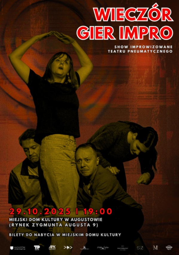 Augustowskie Placówki Kultury i Teatr Pneumatyczny serdecznie zapraszają na kolejne spotkanie imrpowizowane! W środę 29 października 2025 roku o godz. 19:00 w Sali widowiskowej MDK (Rynek Zygmunta Augusta 9, wejście od ul. Kościelnej, II piętro) Pneumatycy będą czekać na Państwa z zestawem gier improwizowanych.