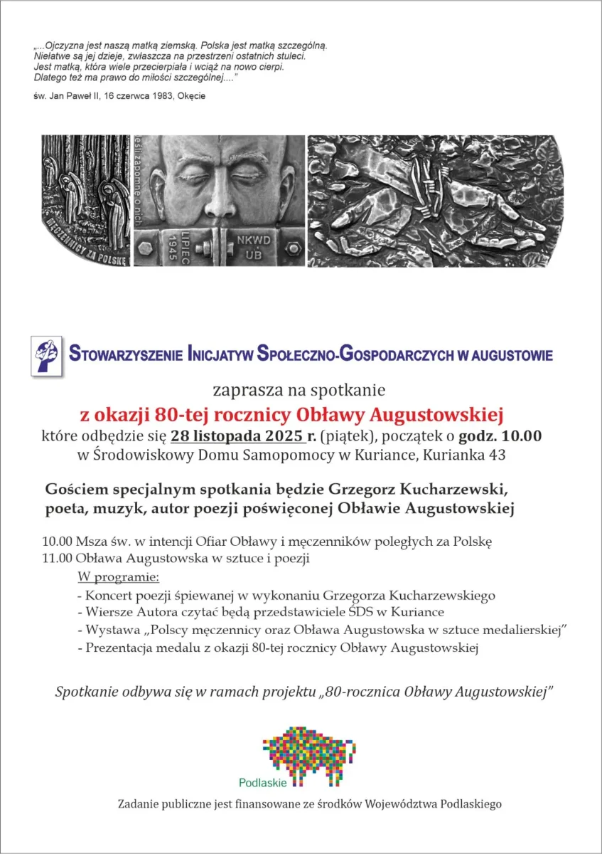 Stowarzyszenie Inicjatyw Społeczno-Gospodarczych w Augustowie, zaprasza na spotkanie z okazji 80-tej rocznicy Obławy Augustowskiej, które odbędzie się