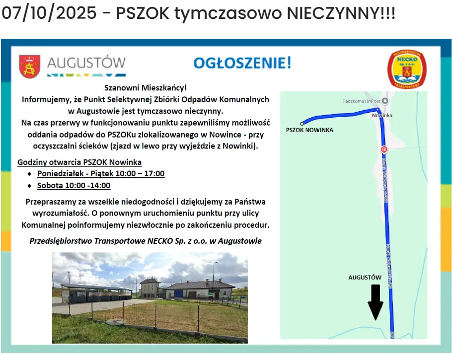 Od października 2025 r., Punkt Selektywnej Zbiórki Odpadów Komunalnych (PSZOK) w Augustowie jest tymczasowo nieczynny. Wynika to z prowadzonych przez spółkę BIOM, przedłużających się procedur związanych z uzyskaniem zgody na otwarcie gotowego, nowego PSZOK.