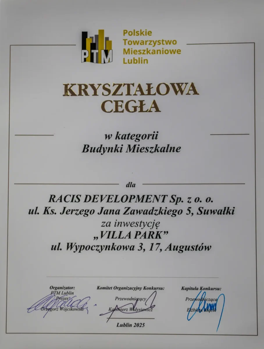 To wyróżnienie przyznawane przez Polskie Towarzystwo Mieszkaniowe w Lublinie jest potwierdzeniem najwyższych standardów, jakości wykonania oraz dbałości o komfort mieszkańców, które od lat stanowią fundament naszej pracy.