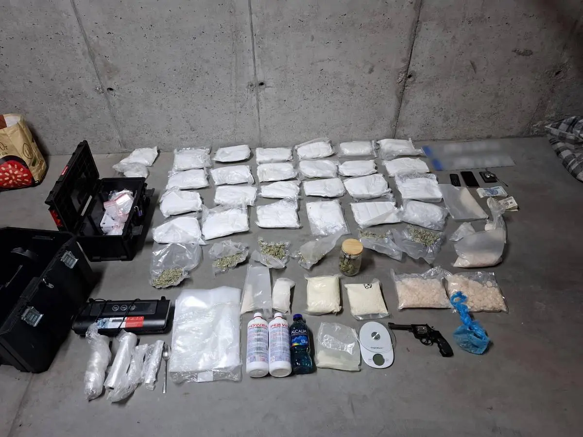 Policjanci ustalili, że w grupie działają zarówno mężczyźni, jak i kobiety. Pierwsza osoba została zatrzymana w mieszkaniu, w którym w zamrażalniku i szafkach mundurowi znaleźli blisko 420 gramów amfetaminy, blisko 60 gramów 3-CMC oraz ponad 14 gramów ziela konopi innych niż włókniste. Mężczyzna usłyszał zarzut handlu narkotykami i na 3 miesiące trafił do aresztu. Drugi zatrzymany wpadł w ręce mundurowych na jednym z białostockich osiedli. W mieszkaniu zatrzymanego, w pomieszczeniach gospodarczych i garażu funkcjonariusze znaleźli i zabezpieczyli ponad 25 kilogramów amfetaminy, blisko 5 kilogramów 3-CMC, ponad 5 gramów kokainy i ponad 800 gramów ziela konopi innych niż włókniste, litr płynnej amfetaminy, a także broń palną bez wymaganego zezwolenia – rewolwer oraz 26 sztuk amunicji.