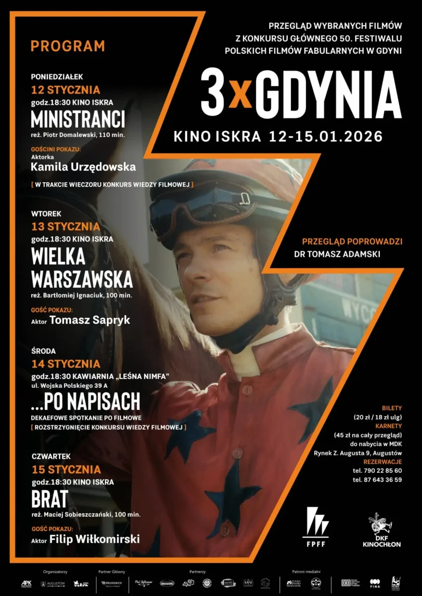 Drugiego dnia – 13 stycznia o godz. 18:30 – pokażemy Państwu „Wielką Warszawską” Bartłomieja Ignaciuka, czyli opowieść o młodym dżokeju marzącym o sportowej karierze. Zwieńczeniem tych marzeń jest udział w najważniejszej gonitwie w Polsce – Wielkiej Warszawskiej. Główny bohater – Krzysiek wkracza w środowisko wyścigów konnych z naiwnością nowicjusza. Szybko orientuje się, że gonitwy to siatka zależności, potężnych interesów i manipulowanie wynikami. Chłopak wierzy, że może to zmienić, szczególnie że kraj stoi na krawędzi wielkich przemian. Upadek komuny daje nadzieję, że przyszłość będzie tylko lepsza. Jednak w świecie korupcji i nieczystych zagrywek ciężko jest pozostać bez skazy. Czy Krzyśkowi uda się oprzeć wielkim pieniądzom i szybkiej karierze? Jak wiele jest w stanie poświęcić, by rozsadzić układ?