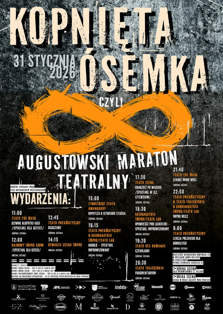 Do wspólnej scenicznej zabawy Teatr Pneumatyczny zaprosił zaprzyjaźnione zespoły teatralne z różnych stron Polski oraz z Litwy! Tym samym, wespół z Teatrem i Stowarzyszeniem Pneuma mamy przyjemność zaprosić Państwa na wydarzenie o charakterze transgranicznym i ogólnopolskim… AUGUSTOWSKI MARATON TEATRALNY „KOPNIĘTA ÓSEMKA” już 31 stycznia 2026 w Miejskim Domu Kultury w Augustowie!