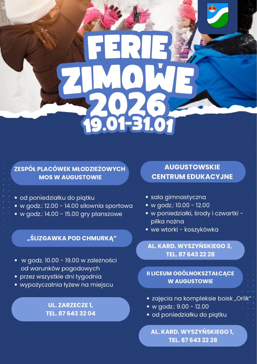 W czasie ferii zimowych 2026 Powiat Augustowski zaprasza dzieci i młodzież do udziału w bezpłatnych zajęciach sportowo-rekreacyjnych. Aktywności będą odbywać się w dniach od 19 do 31 stycznia w kilku miejscach na terenie Augustowa.