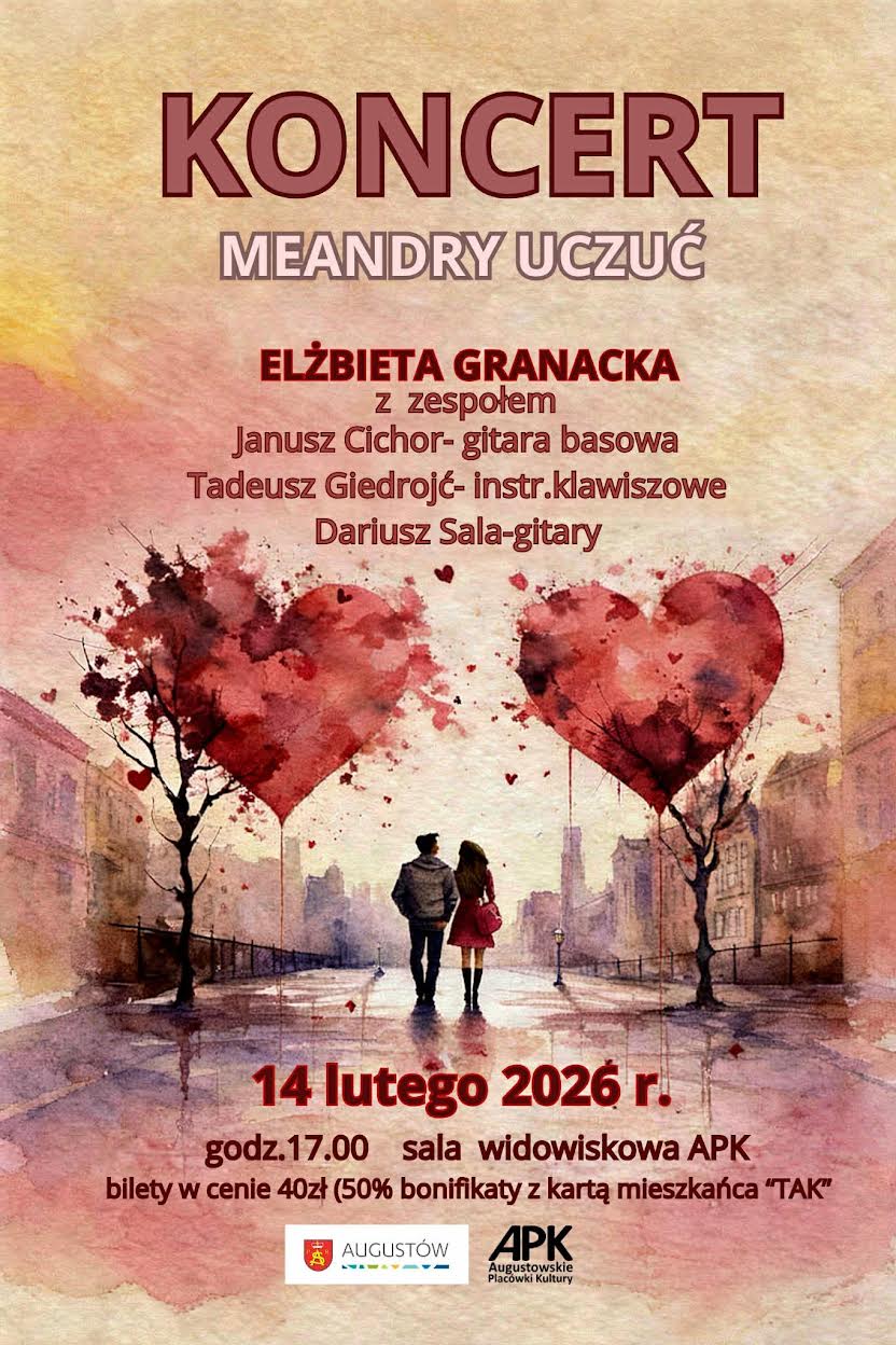Augustowskie Placówki Kultury serdecznie zapraszają na piękny poetycki koncert! W sobotę 14 lutego 2026 w sali widowiskowej Miejskiego Domu Kultury (Rynek Zygmunta Augusta 9, wejście od ul. Kościelnej II piętro) o godz. 17:00 rozpocznie się wydarzenie, w którym zaprezentuje się Elżbieta Granacka oraz jej grający przyjaciele: Janusz Cichor (gitara basowa), Tadeusz Giedrojć (instrumenty klawiszowe) i Dariusz Sala (gitary). Podczas koncertu „Meandry Uczuć” będzie można usłyszeć piosenki oraz utwory z nurtu poezji śpiewanej – nie zabraknie utworów Agnieszki Osieckiej, Leonarda Cohena, piosenek z Kabaretu Starszych Panów i tych Elżbiety Granackiej…