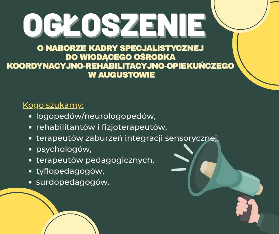 Poradnia Psychologiczno-Pedagogiczna w Augustowie zaprasza specjalistów/terapeutów do składania ofert na realizację usług wynikających z programu kompleksowego wsparcia dla rodzin zwanego dalej Programem „Za życiem” w ramach zadań Wiodącego Ośrodka Koordynacyjno-Rehabilitacyjno- Opiekuńczego w powiecie augustowskim – „Wieloaspektowa i kompleksowa pomoc niepełnosprawnemu dziecku w okresie od 0. roku życia do rozpoczęcia nauki w szkole oraz jego rodzinie”.