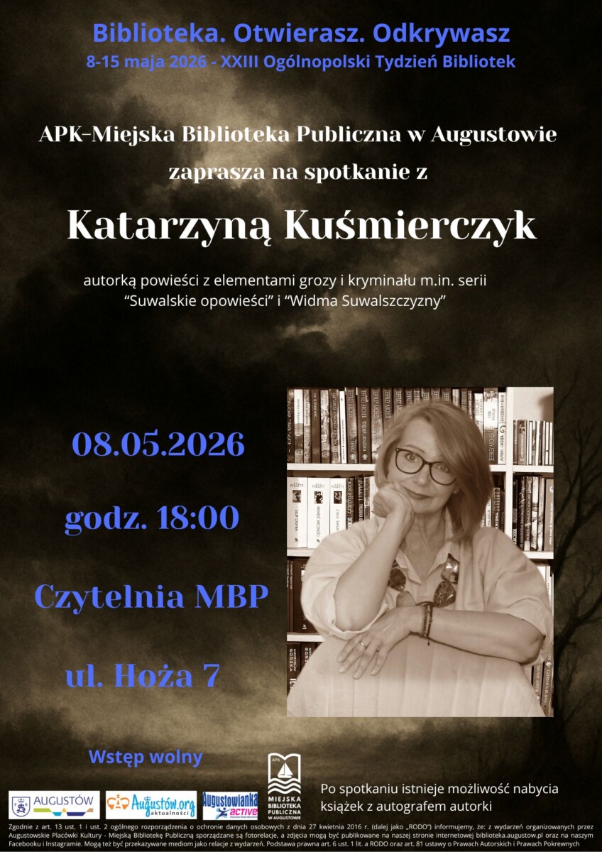 W ramach XXIII Ogólnopolskiego Tygodnia Bibliotek w Augustowie odbędzie się spotkanie autorskie z Katarzyną Kuśmierczyk – pisarką znaną z powieści łączących elementy grozy i kryminału.