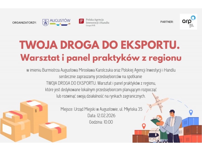 Burmistrz Augustowa Mirosław Karolczuk oraz Polskiej Agencji Inwestycji i Handlu serdecznie zaprasza przedsiębiorców na spotkanie TWOJA DROGA DO EKSPORTU. Warsztat i panel praktyków z regionu, które jest dedykowane lokalnym przedsiębiorcom planującym rozpocząć lub rozwinąć swoją działalność na rynkach zagranicznych.