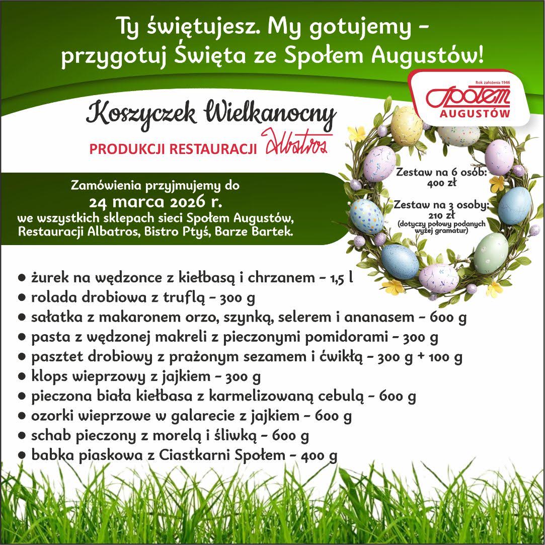 Zamówienia przyjmowane są do 24 marca w sklepach Społem Augustów, Restauracji Albatros oraz w barach Bartek i Ptyś.
