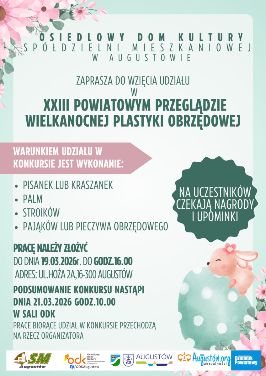 Osiedlowy Dom Kultury Spółdzielni Mieszkaniowej w Augustowie zaprasza do udziału w XXIII Powiatowym Przeglądzie Wielkanocnej Plastyki Obrzędowej. Wydarzenie skierowane jest do osób w każdym wieku – dzieci, młodzieży oraz dorosłych, którzy chcą zaprezentować swoje wielkanocne prace inspirowane tradycją.
